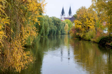 Almuehl river in Eichstatt during autumn.Cathedral of Eichstaett in fall, Bavaria, Germany