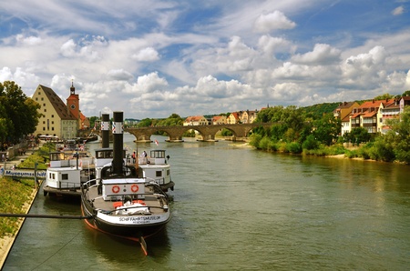 Regensburg. Embankment and old stone bridge over the Danube river.