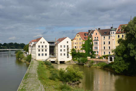 Scenic spring view of old buildings at Danube river pier and street architecture in the Old Town of Regensburg, Bavaria, Germany