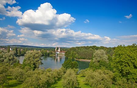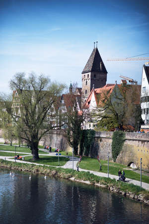 Tranquil Scenic of Walking Paths on Banks of River Blau in front of Walled City with View of Historical Metzgerturm Butcher Tower on Sunny Spring Day with Blue Vignette Sky