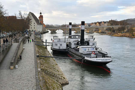 Regensburg, Bavaria, Germany - 11/11/2014: Danube River. Houses on Naberzhnaya. The stone bridge is the main attraction of Regensburg.
