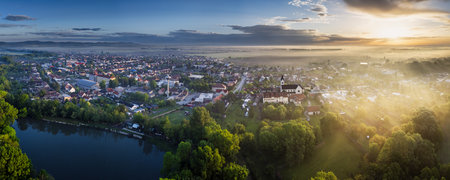Scenic view of Sava river and settlements around Slavonski Brod during sunny day with fluffy clouds.