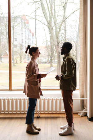 Young people discussing report together while standing against the big window