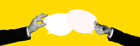 Contemporary art collage. Talking lips, one blue, another yellow, engage in dialogue with speech bubbles, representing exchange and mutual understanding. Concept of communication, teamwork. Ad