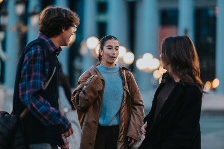 Teenage friends in the city chatting at dusk, stylish outfits, urban evening vibes