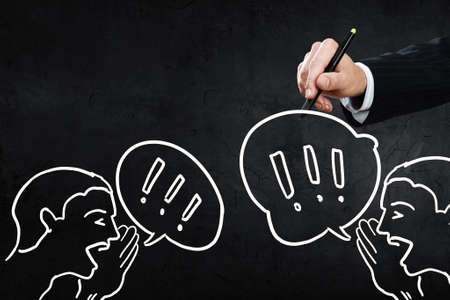 Close up of hand drawing dialogue between two on blackboard