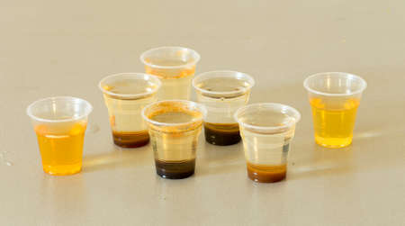 This image features various liquid samples in clear glass containers, showcasing a range of colors and measurements in a modern laboratory setting.