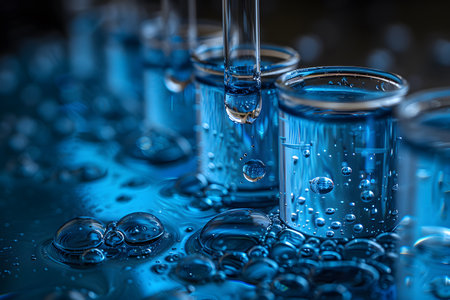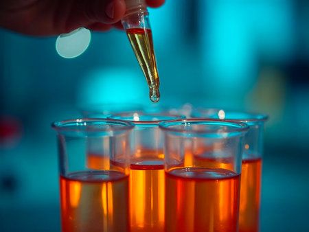 AI generated close up of hand in dark glove using dropper above row of glass test tubes in modern laboratory with cool blue tones and soft orange bokeh lights conveying focus and precision