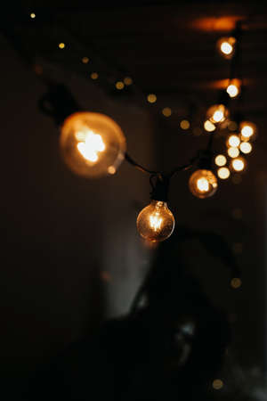 photo of a garland of light bulbs on a dark background. selective focus. christmas and new year concept