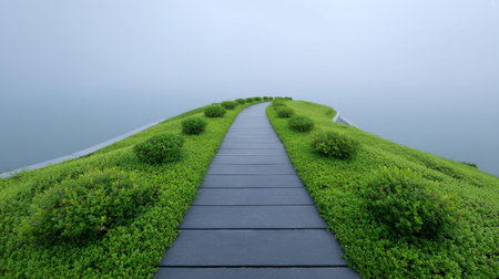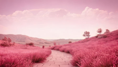 shade outskirts curved road ground tile walking path way in floral wild bushes narrow corridor
