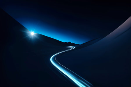 A luminous, winding line of neon light slices through a shadowy water surface, forming graceful curves that evoke a sleek, sci-fi aesthetic under the night sky.