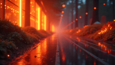 Winding Forest Road at Dusk: An aerial shot captures a curving road through a dense, lush forest at twilight, with a small section of scorched earth creating a dramatic contrast.