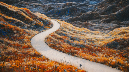 Brown winding path uphill with green meadow and no trees. Moody tones