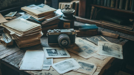 A close-up of a vintage camera on a wooden table, surrounded by antique photographs and papers, capturing the essence of nostalgia and history.