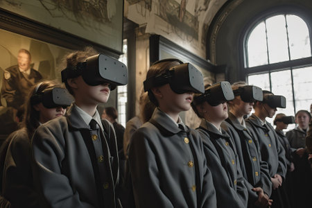 Students in uniforms using virtual reality headsets in a historical classroom.