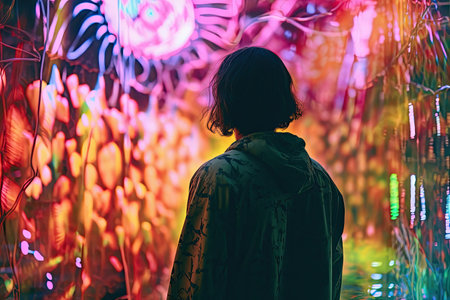 AI Generated. Silhouette of a Person Gazing at the Abstract Colorful Lights in a Dark Space of Digital World