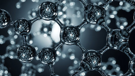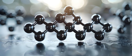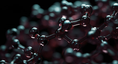 This image showcases a molecular structure composed of interconnected spheres and rods, set against a dark backdrop. The structure is rendered with a glossy appearance, highlighting the connection points. A bokeh effect in the background adds depth. Suitable for scientific publications, educational materials, or use in technology-related projects.