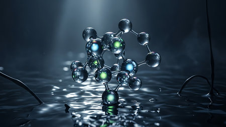 Transparent 3D molecular structure floating on a glossy surface, symbolizing nanotech, anti-aging cosmetics, and pharmaceutical innovation