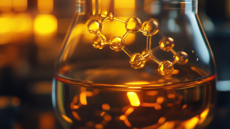 Close-up of laboratory glassware featuring a brown liquid and a clear solution. Molecules in background emphasize the essence of chemistry and research. Ideal for scientific projects.
