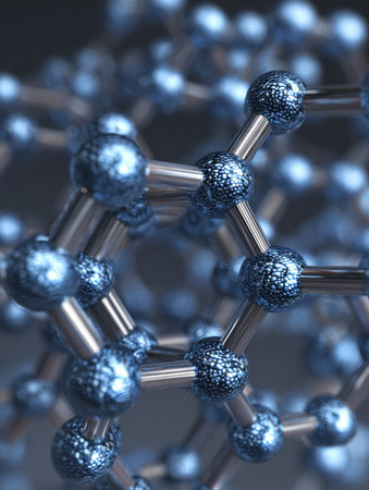High-quality visualization of a molecular structure model showcasing shiny metallic atoms and vibrant spheres in a laboratory backdrop. Ideal for educational materials.
