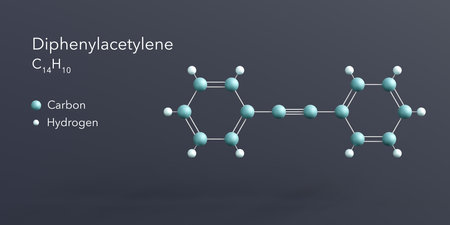 diphenylacetylene molecule 3d rendering, flat molecular structure with chemical formula and atoms color coding