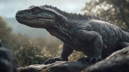 Realistic digital artwork of a dinosaur by a lush river. Concept of prehistoric wildlife, nature illustration, extinct animals.