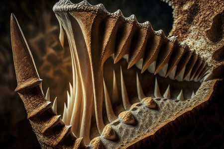 close-up of tooth from a fossilized dinosaur, surrounded by natural light, created with generative ai