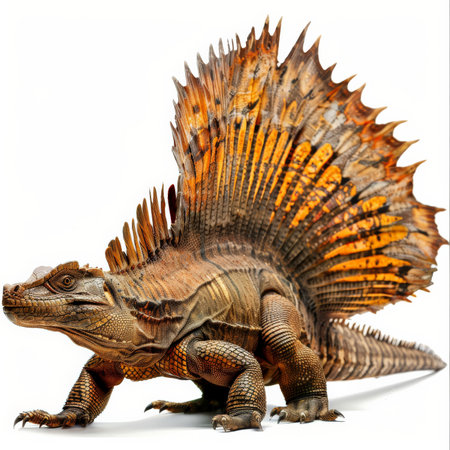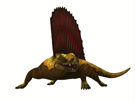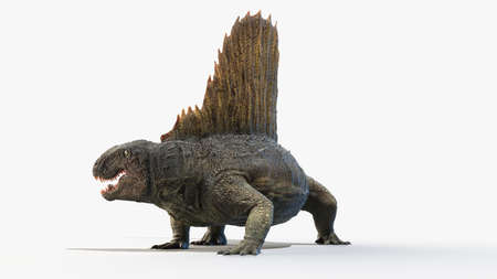 A striking Dimetrodon with its sail-like fin on its back, basking in the sun, isolated on white background.