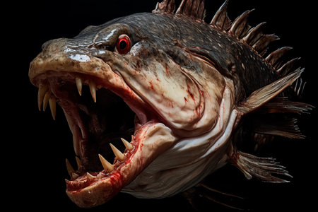 Deep-water fish at the very bottom of the ocean. A scary fish with big teeth. underwater world. Generative AI illustration