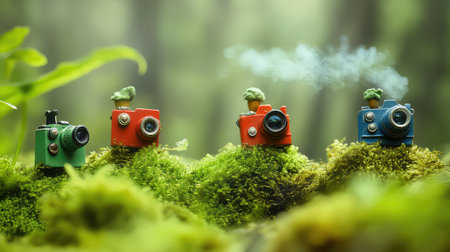 A playful arrangement of colorful vintage cameras with broccoli heads, set in a lush green forest, creating a whimsical atmosphere for photography lovers.