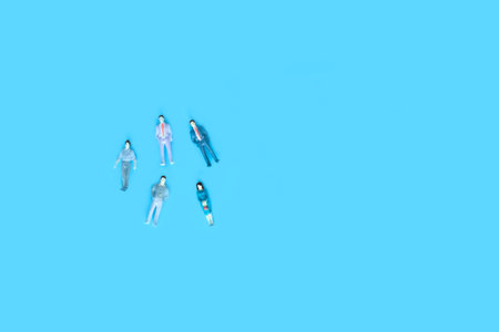 Miniature human figure figurine male female doll row line border copy text sign space on blue paper background