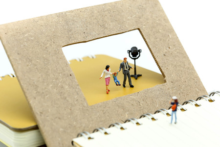 Creative idea concept - miniature photographer with vintage golden book on open paper notebook