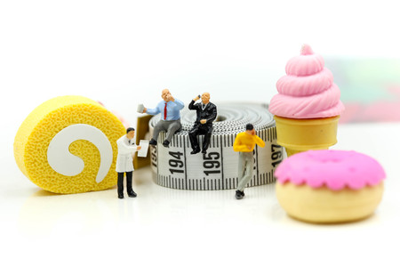 Miniature people : Doctor and patient with Glucose meter diabetes test and Syringe with measuring tape,concept of diabetes, healthy lifestyles and nutrition