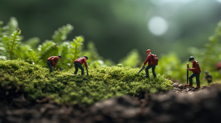 Miniature figures of hikers trekking through a lush mossy landscape with sunlight filtering through.