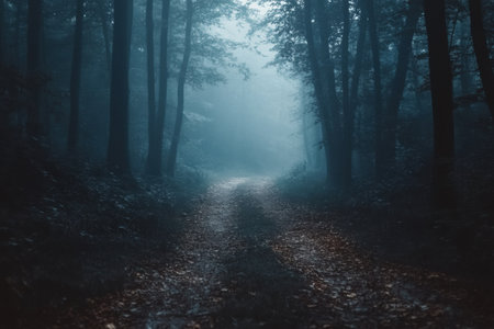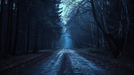Foggy road in the misty fairytale dark forest, scary halloween concept.