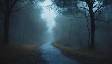 A dark and mysterious forest path shrouded in fog at night.