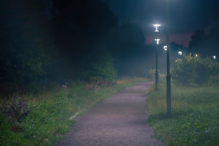 A foggy night scene with a park path illuminated by a series of street lights, creating a serene and slightly eerie atmosphere. The soft glow of the lights enhances the misty ambiance.
