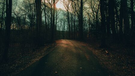 A gravel road winds through a forest in the soft light of late afternoon. The trees are bare, the leaves fallen.