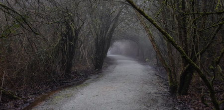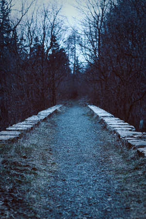 mysterious pathway. Footpath in the dark, foggy, autumnal, mysterious forest. long exposure shot