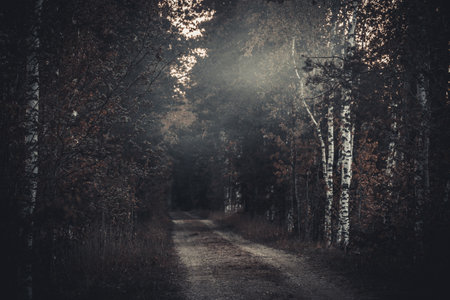 Path in the colorful, dark autumn forest. Seasonal, peaceful background concept.