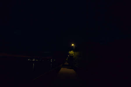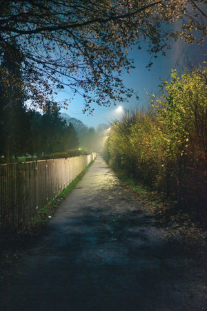 Sidewalk between the fence and the bushes, night scene of the promenade in the park during late autumn, the city of Cacak in Serbia.