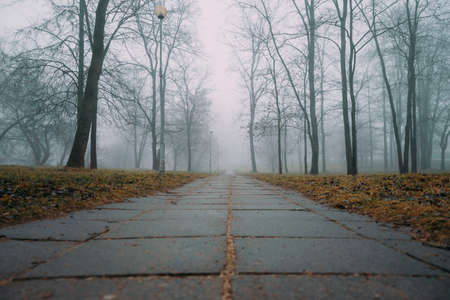 Misty autumn park with lamp posts and fallen leaves on a foggy day. Concept of fall season, misty weather, tranquil nature, serene park.