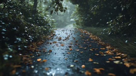Autumnal road in the forest with fallen leaves in the rain