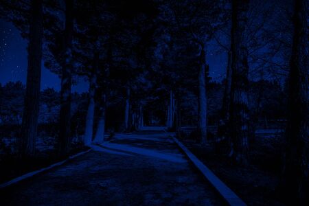 Dark forest panorama, path in magical scary forest at night, digital painting.