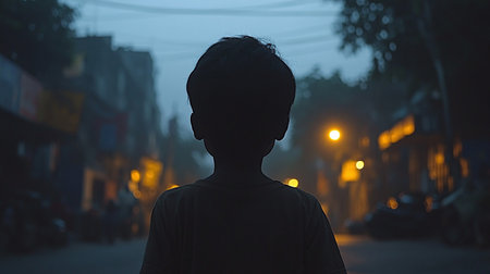 Generative AI Image of Back View of Boy Standing on the City Street in the Evening