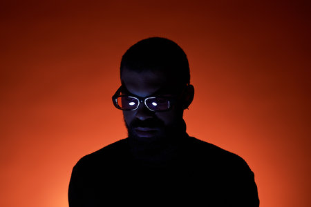 Silhouette of man in sunglasses against vibrant orange background, creating a striking and stylish image