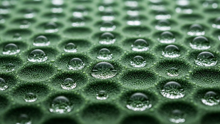Macro photograph of clear water droplets resting within the hexagonal indentations of a textured green surface, creating a unique pattern.