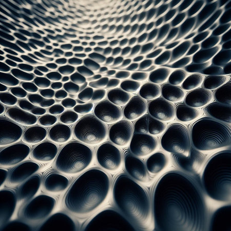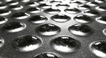 Close-up of a textured metal surface featuring a pattern of raised, rounded shapes, creating a tactile and visually interesting monochrome background.