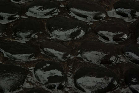 Wet black cobblestone pavement of smooth volcanic stones, texture, top view, closeup, background.