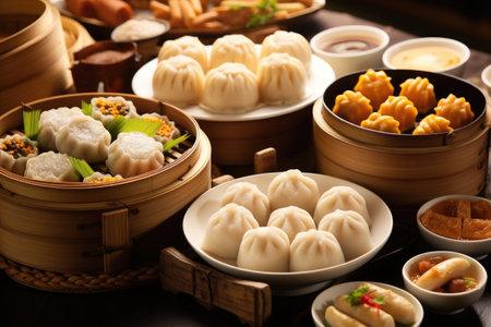 chinese dim sum selection with dumplings and buns, created with generative ai